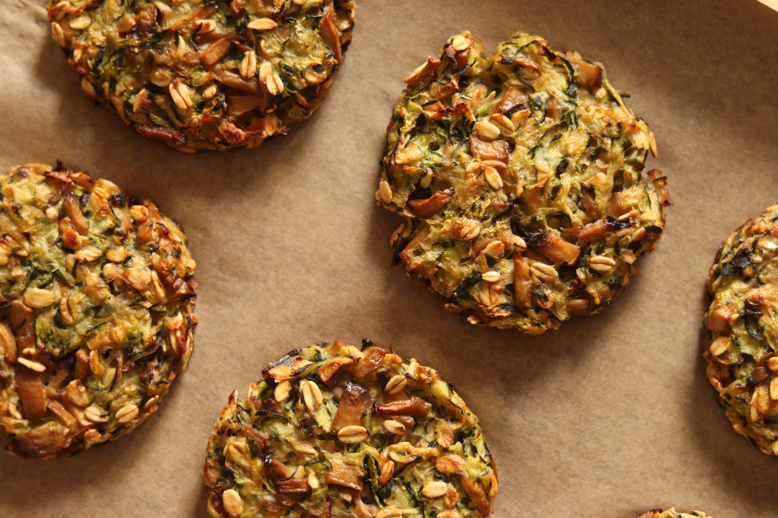 După ce s-a răcit amestecul de ciuperci și ceapă, combină-l cu dovlecelul bine stors, fulgii de ovăz, oul și condimentele.